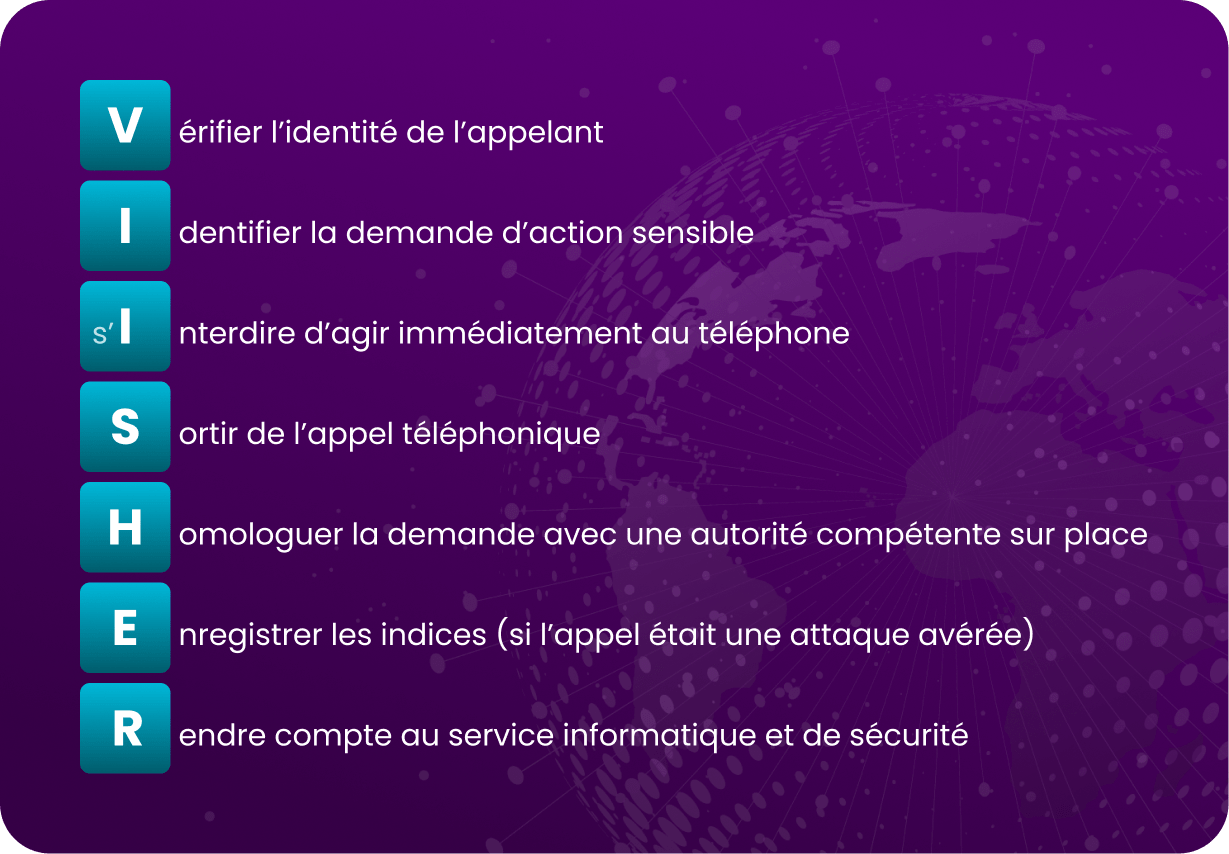 Face à cette menace, Hucency innove : nous avons créé V.I.I.S.H.E.R, un moyen mnémotechnique inédit dédié à la cybersécurité, proposé à nos clients et conçu pour devenir un réflexe universel contre les attaques par téléphone.